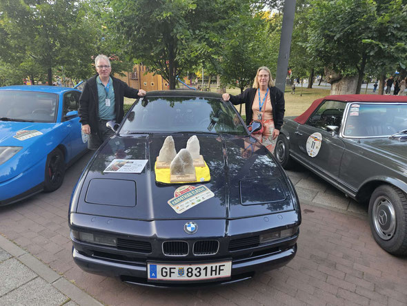 Eigentlich wollten Klaus und Angelika mit ihrem 944er dabei sein aber der Porsche war nicht rechtzeitig einsatzbereit. So musste wieder einmal der BMW herhalten. Die Rallye am 9.8. war von Robert Krickl genau auf die Porsche-Kundschaft abgestimmt. Flottes Tempo, immer knapp an der 50er Schnittgrenze und eine 200 km lange, kurvenreiche schöne Strecken mit mehreren Timingprüfungen. Angelika: "Da kam keine Langeweile auf. Auch das Rahmenprogramm entsprach dem Klientel. In Summe ein kurzweiliger und gut organisierter, durchaus sportlicher Staatsmeisterschaftslauf."